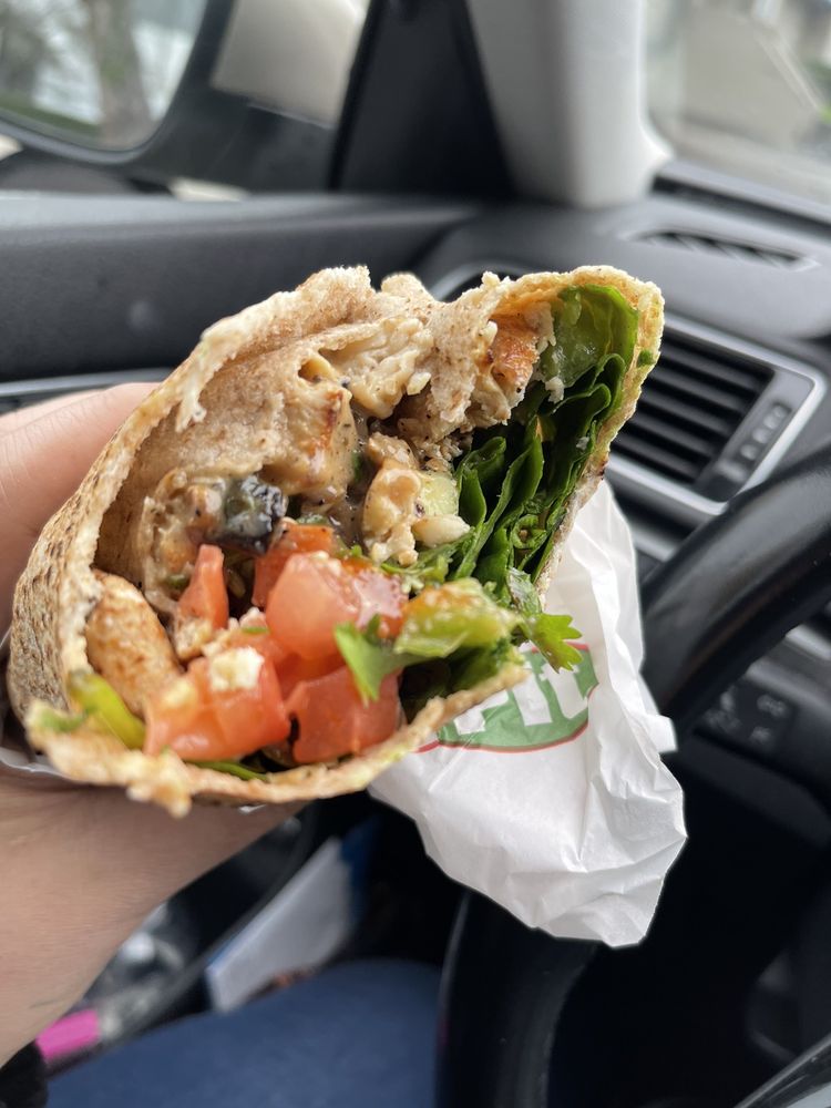 Chicken, black olives, tomatoes, onions, spinach, mozzarella and caesar dressing in a pita seared in avocado oil.